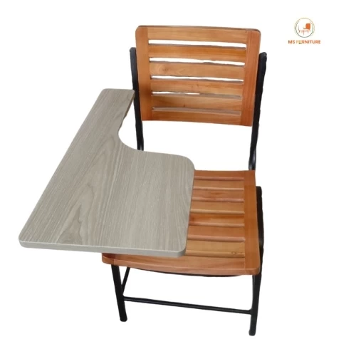 Sturdy classroom chair with a mahogany wood seat and MDF writing pad, designed for comfort and durability in educational settings.